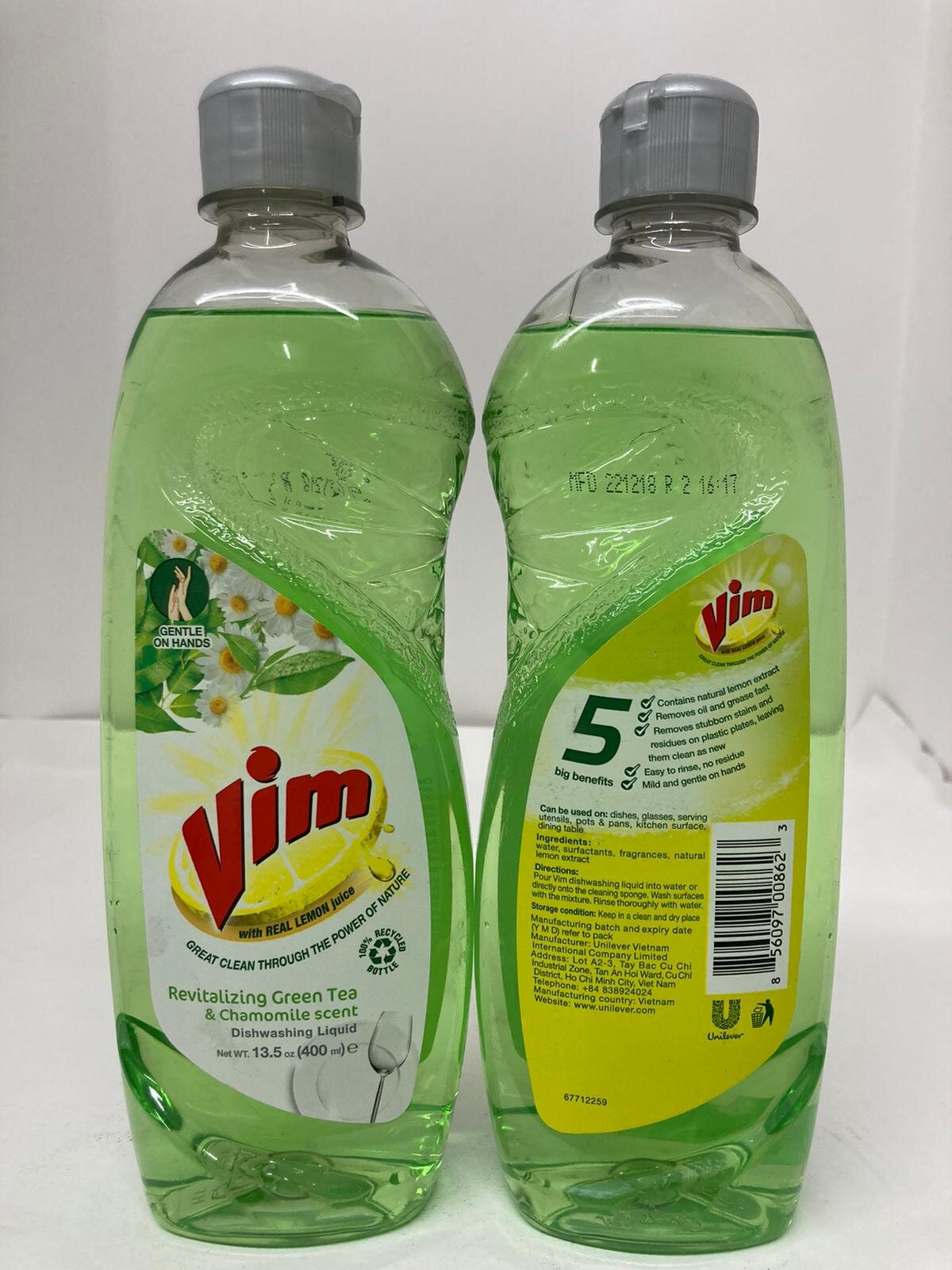 Vim Dishwash Liquid Size: 400 ml Flavour: Green Tea and Chamomile Scent Made in Vietnam UPC: 856097008623 Minimum Order: 24